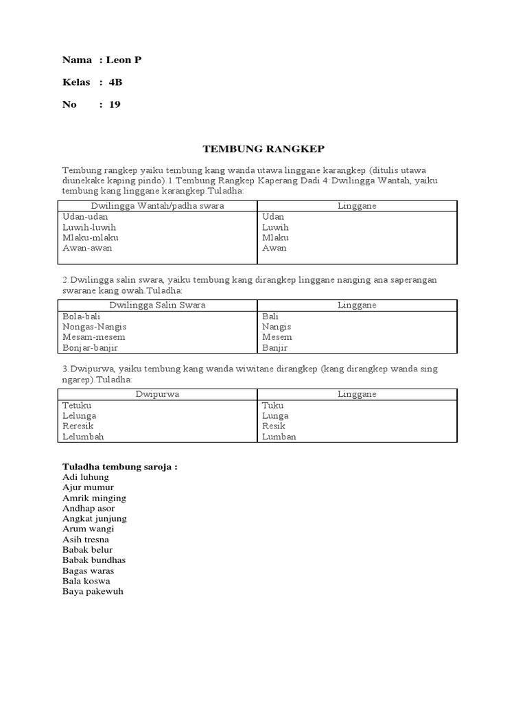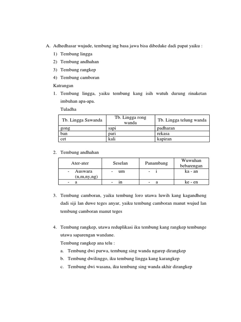 Tembung rangkep dwipurwa dan dwiwasana tidak perlu diberi tanda hubung. Lelaku tetuku jejagong 3. Memiliki tiga macam jenis yang ketiganya akan disebutkan di bawah ini.
