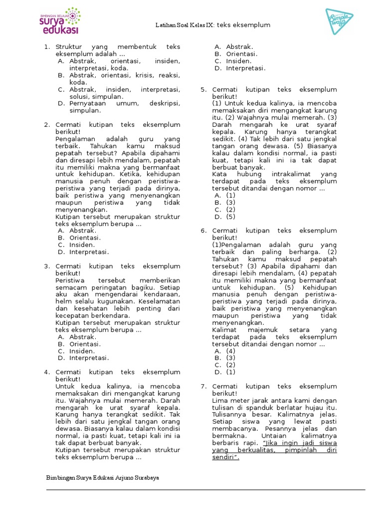 Soal teks eksemplum. Contoh soal teks eksemplum. Biasanya teks eksemplum diawali dengan pengenalan tokoh lalu peristiwa yang dialami tokoh dan ditutup dengan interpretasi yang muncul dari tokoh. 1027 Questions All questions 5 questions 6 questions 7 questions 8 questions 9 questions 10 questions 11 questions 12 questions 13 questions 14 questions 15 questions 16 questions 17 questions 18 questions 19 questions 20 questions 21.