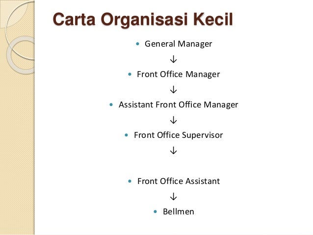 Struktur organisasi kitchen department hotel bintang 5 berbagai. Manajer kantor depan / direktur kamar. Semakin besar hotel, semakin rumit pula struktur yang digunakan, begitu pula sebaliknya jika hotel itu kecil, maka struktur organisasinya pun sederhana.